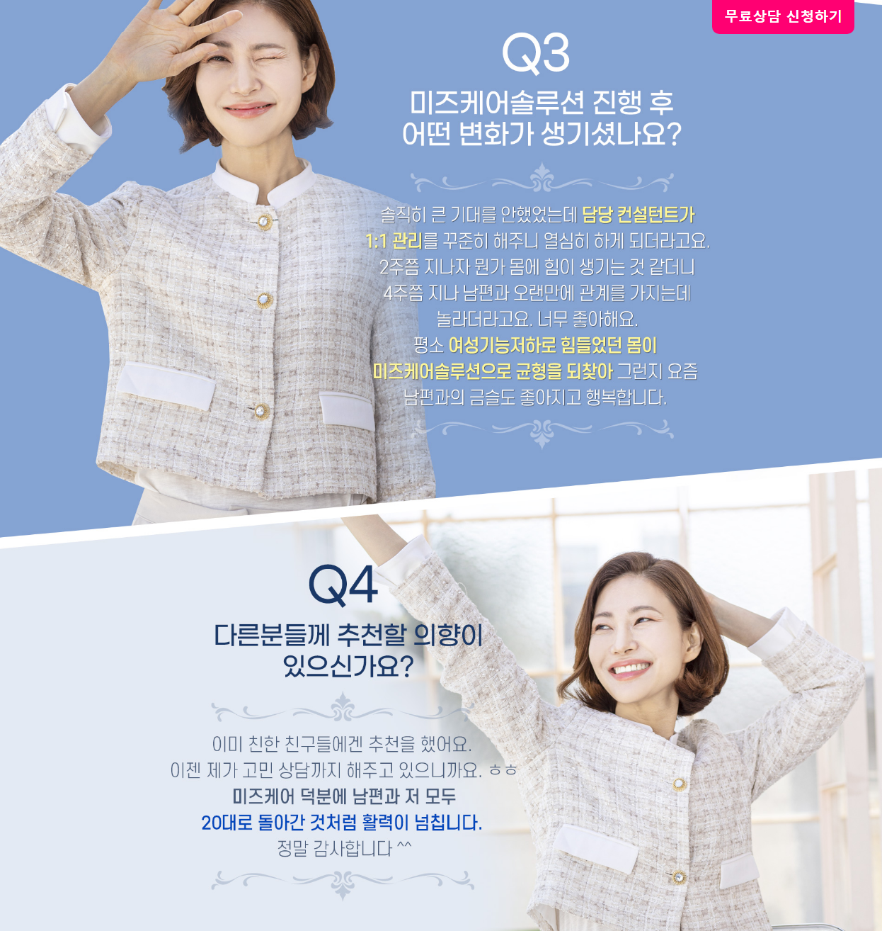 어떤 문제든지 외면한다고 해결되진 않아요. 여성 성기능장애 역시 그렇습니다. ‘이 나이에 무슨...’이라는 생각보다, 이제는 ‘내 몸을 돌보자’는 용기가 필요한 순간이에요. 미즈케어는 부끄러움 대신 자신감을 선택한 여성들에게 건강한 변화를 선물합니다. 혹시 마음속에 망설임이 있었다면, 지금이 바로 그 첫걸음을 뗄 때입니다. 당신의 변화를 진심으로 응원할게요.